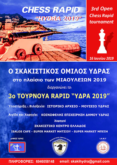 Ο Σκακιστικός Όμιλος Ύδρας, προκηρύσσει το 3ο ανοικτό τουρνουά Rapid με διεθνή αξιολόγηση, με την ονομασία «ΥΔΡΑ 2019».